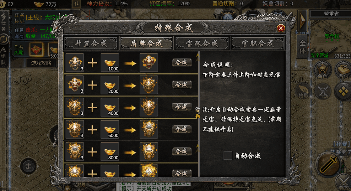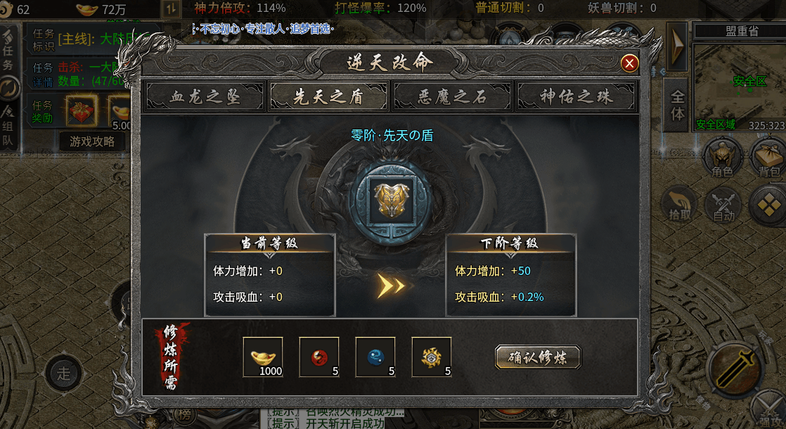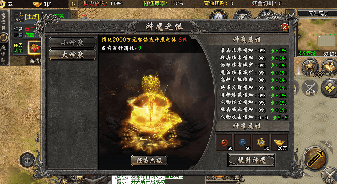 第四步:二大陆优先升级神器,提高打怪速度,打实物和回收元宝